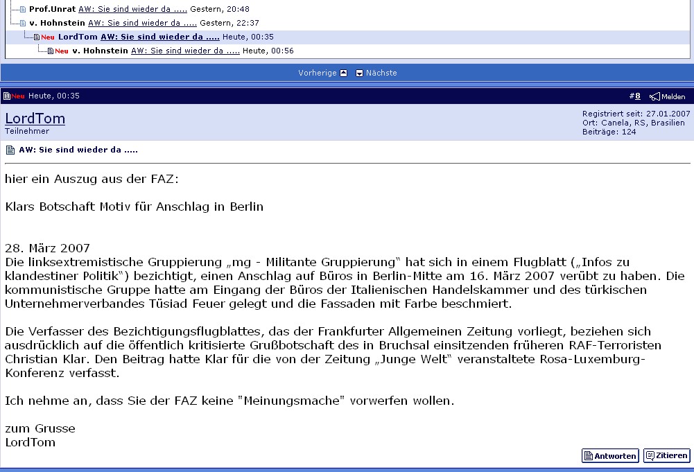 Offensichlich sind sie wieder dazu übergegangen, bei mißliebigen Äußerungen den Beitrag zu löschen, auf den diese sich bezieht. Dabei hatte LordTom nur die FAZ zitiert: lordtom (jpg, 132 KB) (Screenshot)